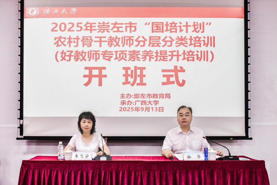为深入贯彻落实国家关于新时代教师队伍建设改革的决策部署,提升崇左市教育系统教师的专业能力与综合素养,9月13日,由崇左市教育局统筹、广西大学承办的2025年崇左市“国培计划”农村骨干教师分层分类培训班(好教师专项素养提升培训班)在我校开班。江南网页版登录入口副院长徐华出席开班式并讲话,江南网页版登录入口副教授范小俊主持开班式。